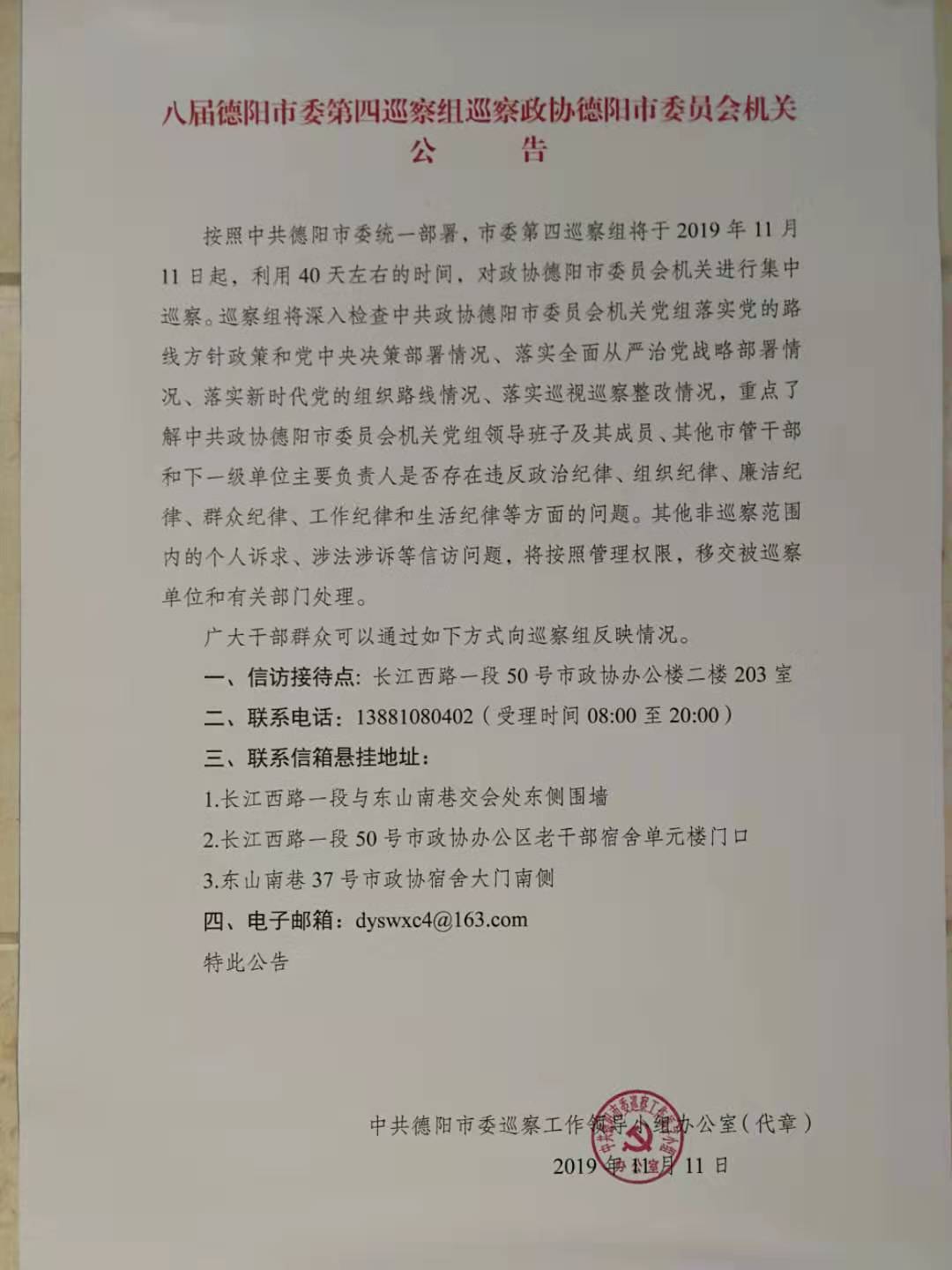 八屆德陽市委第四巡察組巡察政協(xié)德陽市委員會機(jī)關(guān)公告
